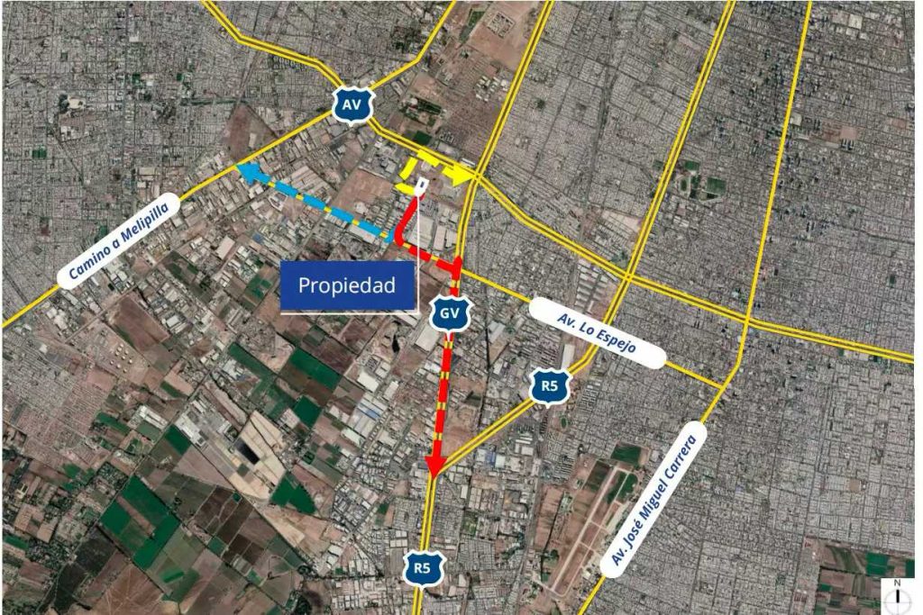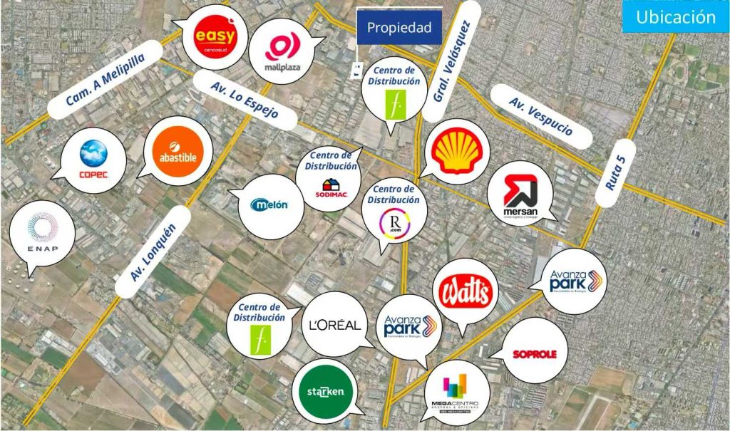 位于 Cerrillos 南部物流走廊核心位置,紧邻 Américo Vespucio、General Velásquez 与 Ruta 5,交通通达性优越。冷库仓储面积约 2,140 m²,办公区 810 m²,另配员工餐厅、宿舍与值守室,功能完善,适用于冷链存储、配送与轻型工业用途。周边为成熟物流与商业分销带,具备长期运营与增值潜力。
